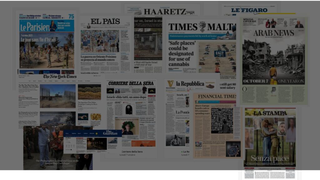 Le prime edizioni cartacee di oggi, 7 ottobre 2024, anche in Italia sono interamente dedicate alle vittime israeliane del 7 ottobre 2023. La Stampa decide di dedicare al ricordo delle vittime l’intera prima pagina con un titolo singolare riferito alla...