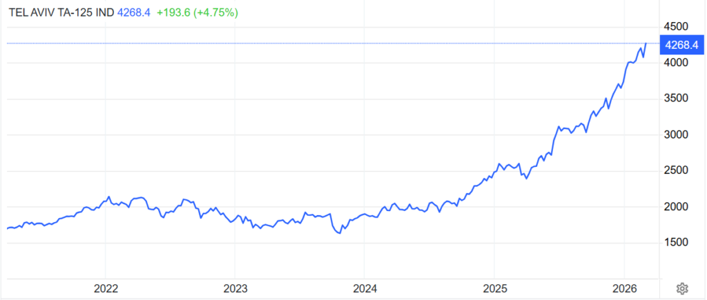 Mentre i mercati globali soffrono sull’onda lunga della guerra scatenata da Israele e Usa contro l’Iran, la Borsa di Tel Aviv macina record. Dal 28 febbraio, giorno dell’inizio dell’offensiva aerea di Washington e Tel Aviv, l’indice della capitale israeliana ha toccato nuovi massimi storici, guadagnando poco meno del 6% lunedì e raggiungendo quota 16.160 punti.