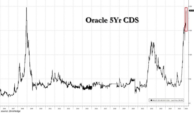 Per capirlo, basta un dato: il costo per assicurarsi contro un eventuale fallimento di Oracle è salito al livello più alto mai registrato, superando perfino quello della crisi del 2008. In finanza è infatti usuale guardare ad un indicatore chiamato Credit Default Swap (CDS) per misurare quanto gli investitori sono preoccupati per il debito di un’azienda. Il CDS di Oracle nelle ultime settimane è salito a 198,18 punti base, raggiungendo un massimo storico.