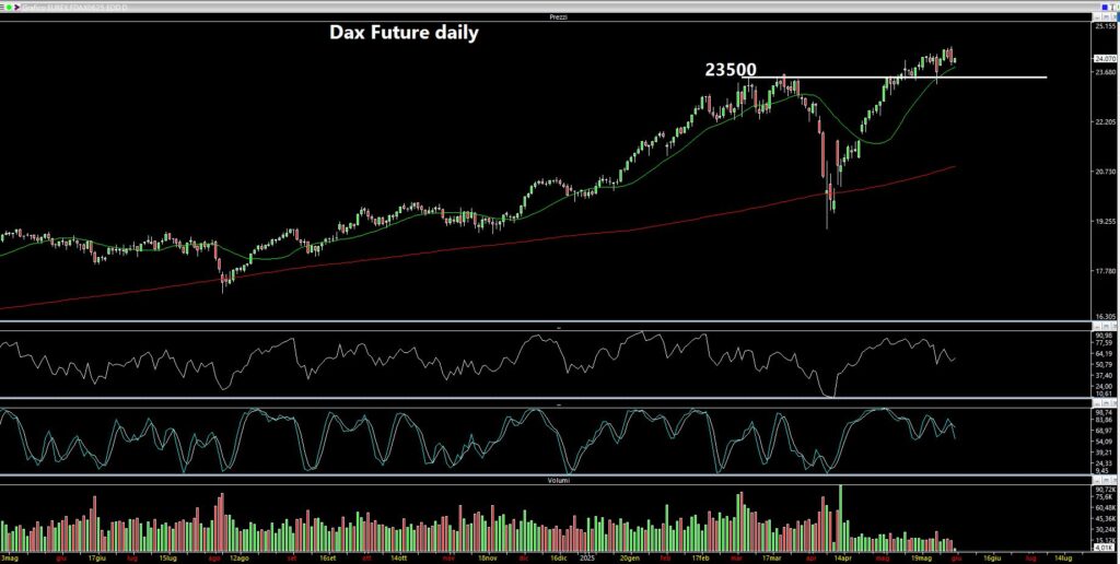 “In Europa – aggiunge Assiso – il Dax Future continua a rimanere ben impostato, ma sta perdendo un po’ di momentum quindi non escludo una fase di neutralità o comunque lateral-rialzista con minore spinta. L’importante è rimanere al di sopra dei 23500 punti rappresentativi dei precedenti massimi storici”.