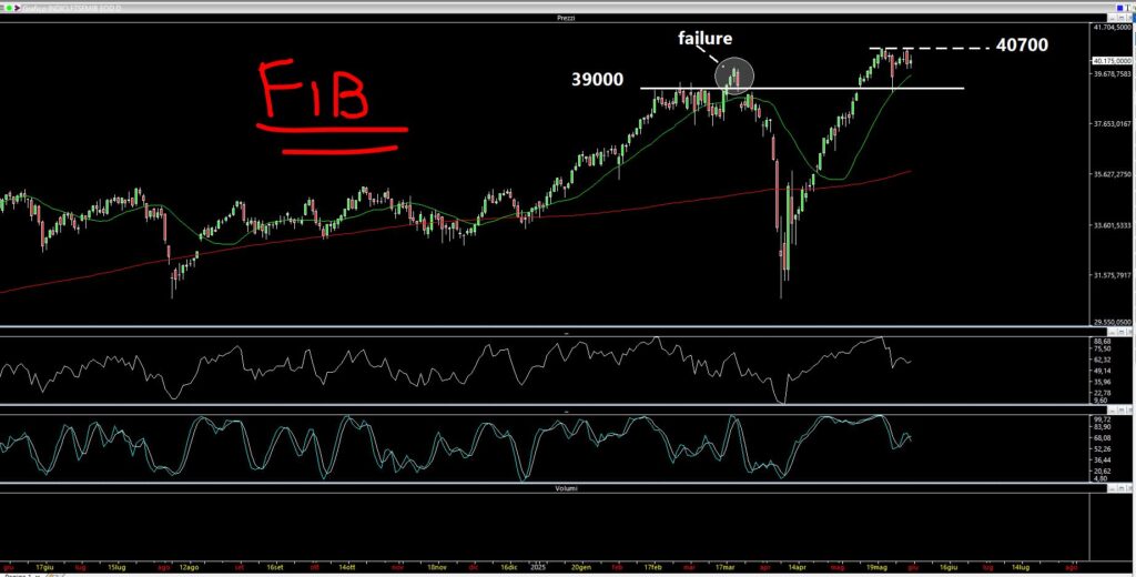 “Il nostro derivato FTSEMIB40 – scrive Assiso – si presenta simile su scala daily al Dax: rimaniamo sopra l’area dei massimi storici (escludendo la failure di breakout di metà marzo prima delle problematiche dei dazi, evidenziata in grigio). Al momento i rialzisti trovano un tappo a 40700 punti ed una base a 39000. La chiusura di ottava è stata in area 40170 punti circa, quindi a metà strada”.