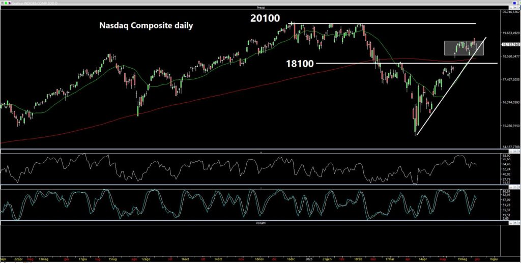 “Discorso analogo per il Nasdaq Composite: apertura in gap up dopo il Memorial Day di lunedì (un grande classico) e tentativo di fuga giovedì post dati di NVIDIA – scrive ancora Pier Nicola Assiso -. Tentativo di fuga non riuscito perché il close weekly è stato a 19113 punti, quindi leggermente sotto il box in formazione. Come per l’S&P500 anche per il Nasdaq vedrei bene un test dei precedenti massimi storici che però si trovano poco sopra i 20mila punti: circa il 5% dai livelli attuali. Non impossibili anche se si entra nei mesi estivi. Anche per questo indice dunque la situazione grafica non è cambiata di molto e il mood rimane nel complesso positivo. Gap da chiudere attorno a 18100, ma al momento siamo distanti”.