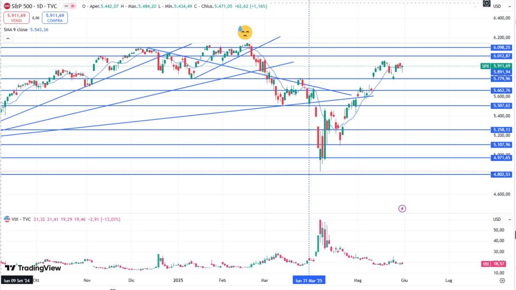 “Dopo la fase correttiva descritta la scorsa settimana – scrive Pier Nicola Assiso su LombardReport.com -, i mercati statunitensi si trovano nuovamente nella parte alta di un box che stanno costruendo. Partiamo dall’S&P500 che dopo il test di 5779 (livello che non ho mai modificato e sotto il quale ci sarebbe un piccolo gap da chiudere) si è riportato a 5900 punti (close weekly@5911). Al di sopra di questo livello troviamo i 6000 punti e poi i massimi storici in area 6100. Come vedete in questa ottava non è cambiato nulla: il mercato in generale si trova in uptrend anche se non escludo una fase di lateralizzazione per le prossime settimane. Naturalmente in questo contesto anche il VIX rimane compresso o comunque sotto la soglia dei 20 punti e questo lascia ben sperare, ma valuteremo insieme: come ben sapete sui mercati nulla è mai scontato e si deve procedere step by step”.