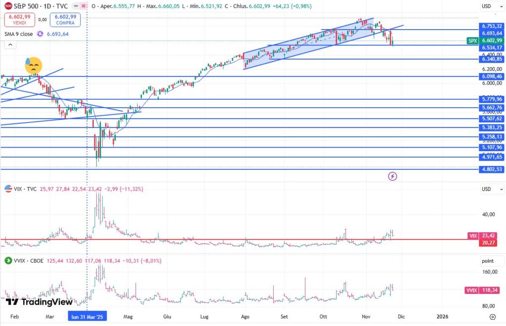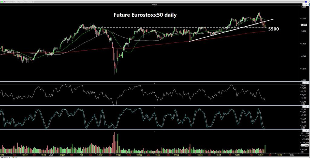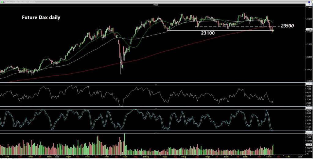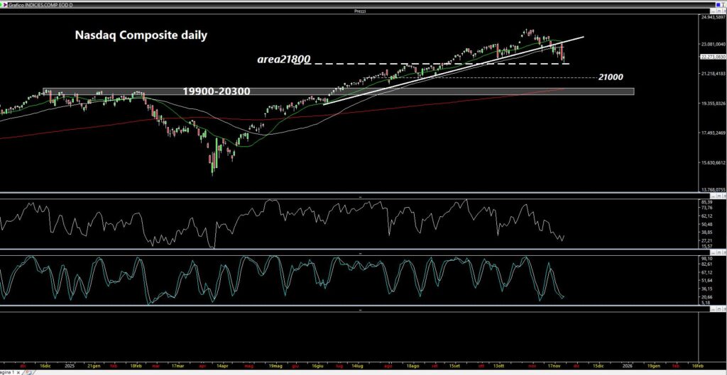 Il Nasdaq Composite al momento è sotto alle medie a 20 e a 50 periodi, come non accadeva da febbraio di quest’anno. “La media a 20 non ha ancora incrociato al ribasso quella a 50 periodi ma poco ci manca – scrive Assiso nell’articolo di sabato 22 novembre 2025 -. Credo che sarà molto importante la prossima settimana. Al momento è stato testato un primo supporto a 21800 ma il rimbalzo di venerdì non mi convince molto. Al di sotto dei 21800 troviamo i 21000 e poi la grossa fascia dei 19900-20300 (al momento prematura)”.