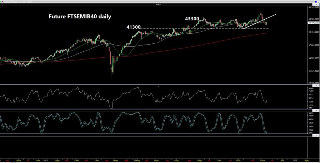 “Il nostro derivato FTSEMIB40 alla fine non è riuscito a tenere i 43300 punti ed ha chiuso a 42490 – osserva Pier Nicola Assiso -. Supporto successivo a 41300. Di fatto siamo potenzialmente rientrati all’interno del rettangolone 41300-43300”.