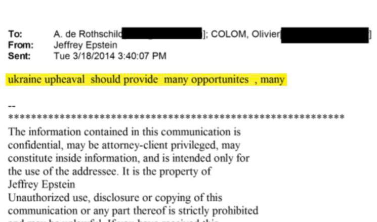 E se Epstein era un asset russo, per quale motivo, in una email datata 18 marzo 2014, presumibilmente indirizzata o in conversazione con Ariane de Rothschild (vicepresidente e membro del board di Edmond de Rothschild Group) e/o Olivier Kohl (consulente internazionale del gruppo), il finanziere scrive: «Il colpo di stato in Ucraina dovrebbe offrire molte opportunità, molte».