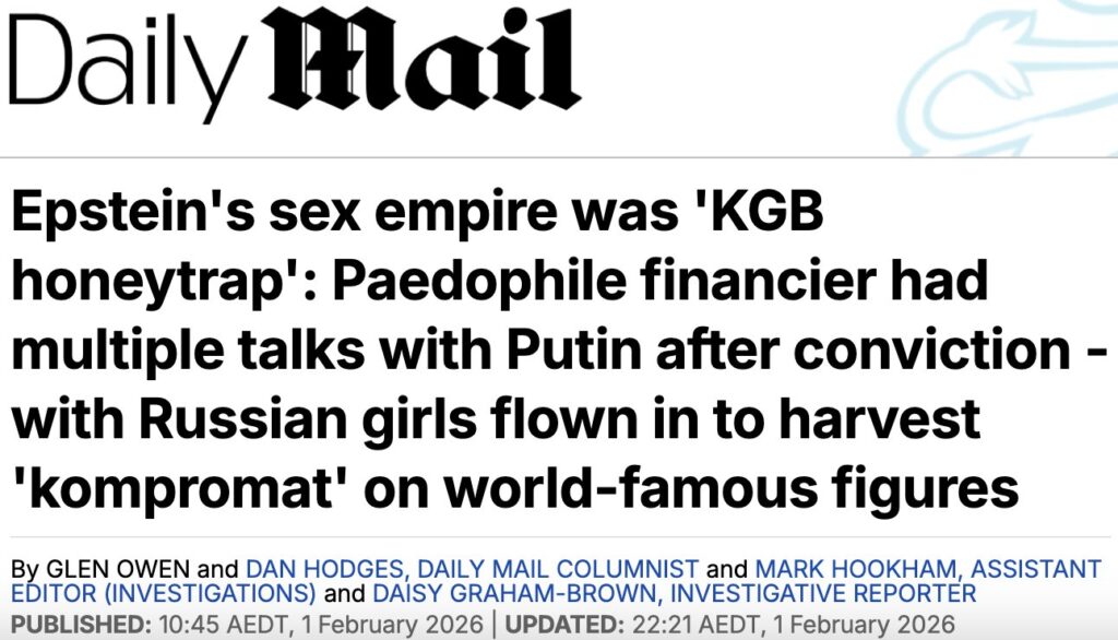 Il Daily Mail, in un articolo sensazionalistico, suggerisce un legame tra Epstein e Vladimir Putin, basandosi su due mere menzioni del nome “Putin” nei documenti diffusi. Tuttavia, lo stesso giornale ammette apertamente l’assenza di prove: “Le fonti dicono che potrebbe spiegare perché Epstein godeva di uno stile di vita ultra-ricco sproporzionato alla sua carriera da finanziere, sebbene non ci sia alcuna evidenza documentaria che colleghi Putin e le sue spie direttamente alle attività illecite di Epstein”.
