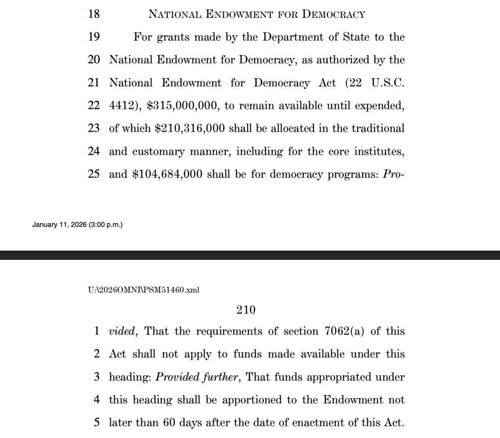 Da qui un altro dato fondamentale: nonostante i roboanti annunci di Trump di “riallineare” l’aiuto estero e eliminare programmi come quelli del Ned, l’ente ha ricevuto 315 milioni di dollari nel 2025 e ne riceverà altrettanti quest’anno. Nonostante le promesse di smantellamento, il Ned continuerà dunque a operare con il supporto del Congresso.