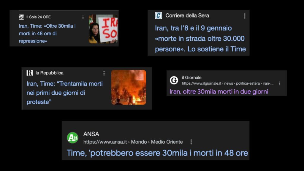 E se il New York Times e la Reuters hanno deciso di non fare affidamento sui report del Time e dell’Iran International, lo stesso non é stato per gran parte della stampa italiana che é corsa al copia/incolla riportando senza alcuna verifica i numeri analizzati in questo approfondimento.