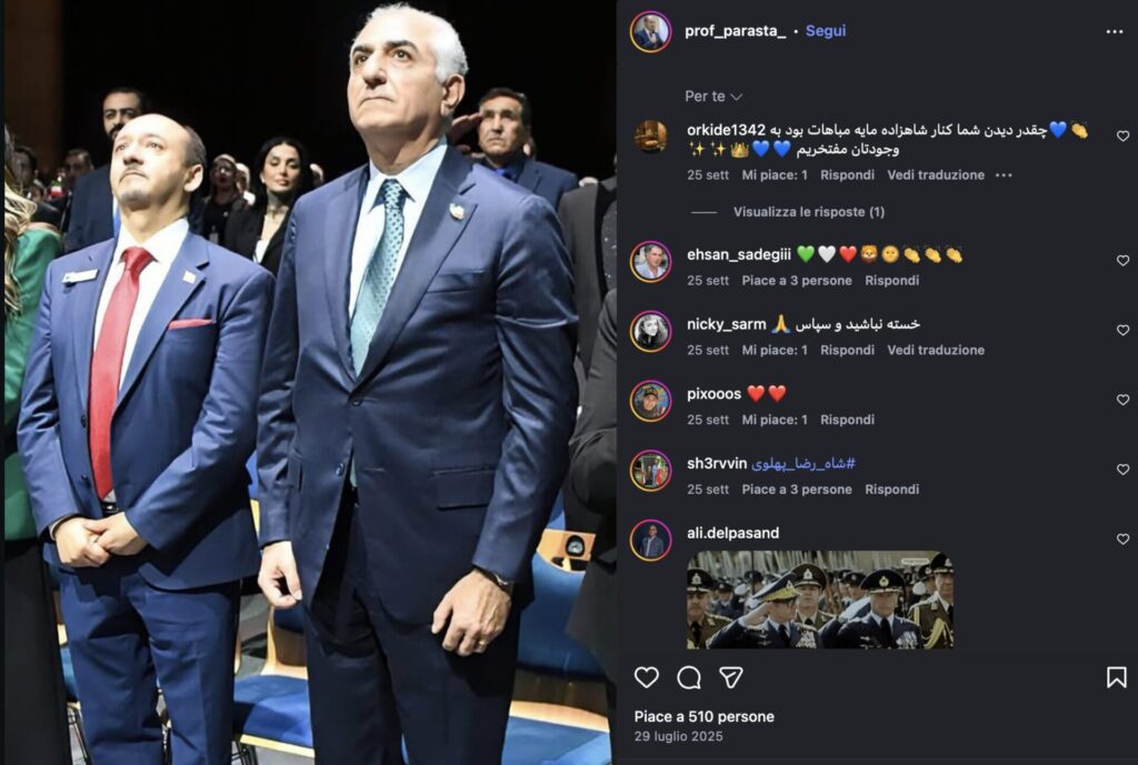 In più emerge un potenziale conflitto di interessi che il TIME non evidenzia in modo adeguato. Sul profilo Instagram riconducibile ad Amir Parasta compaiono numerose foto in cui partecipa a eventi pubblici con Reza Pahlavi, lo scià esiliato e figura centrale dell’opposizione iraniana che in queste settimane ha chiesto aiuto a Israele e USA per effettuare un regime change in Iran.