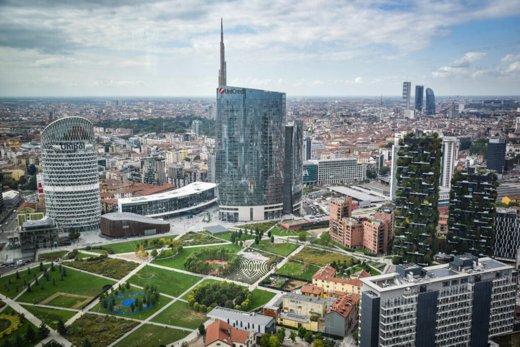 La zona di Porta Nuova nello skyline di Milano visto da Palazzo Lombardia, Milano 15 Settembre 2025 ANSA/MATTEO CORNER